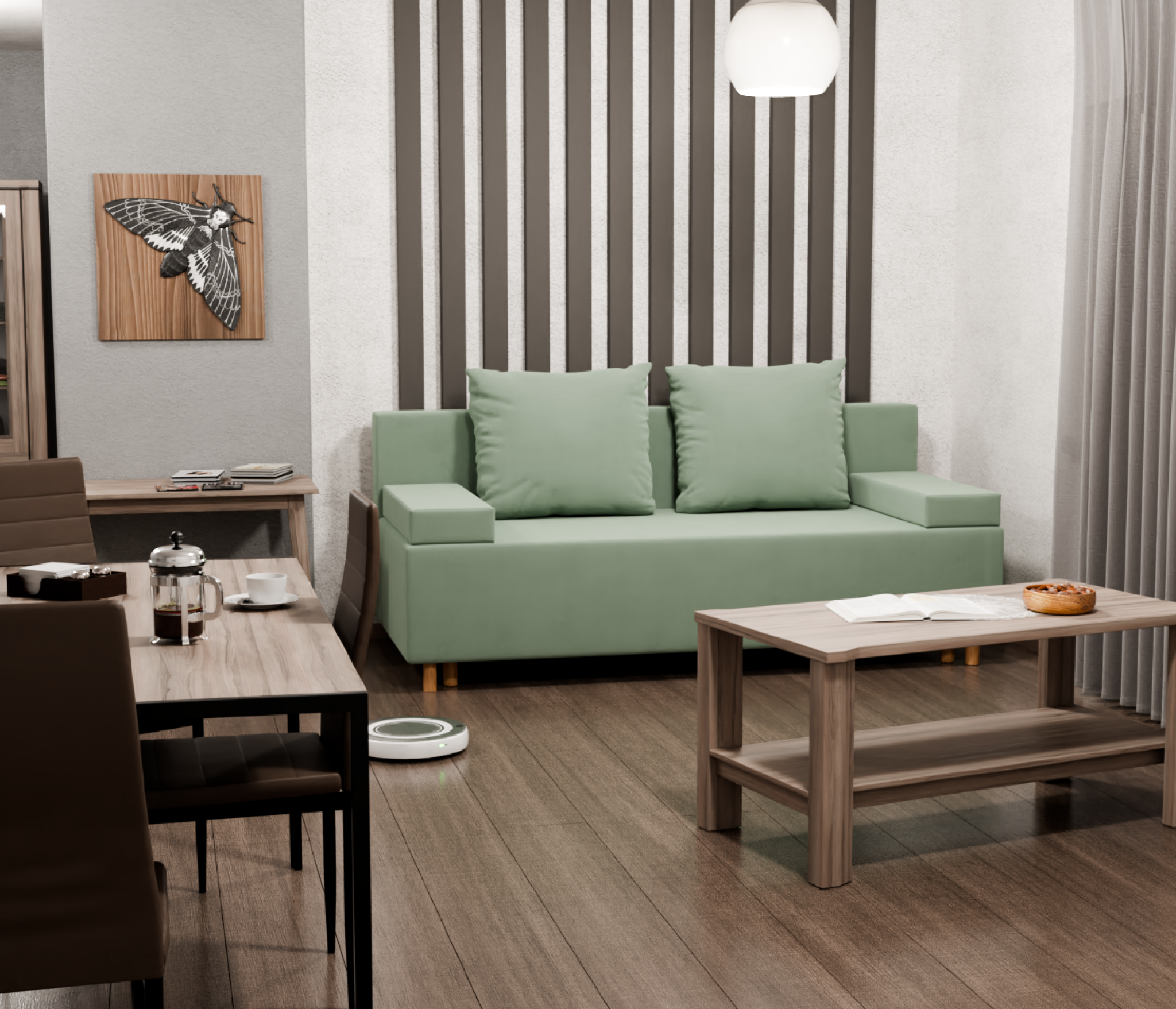 Диван-кровать имеет универсальный угол, что позволяет установить его в любой комнате, даже если она небольшая. Обивка выполнена из высококачественного велюра, который не только выглядит стильно, но и легко чистится.