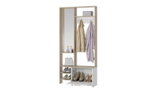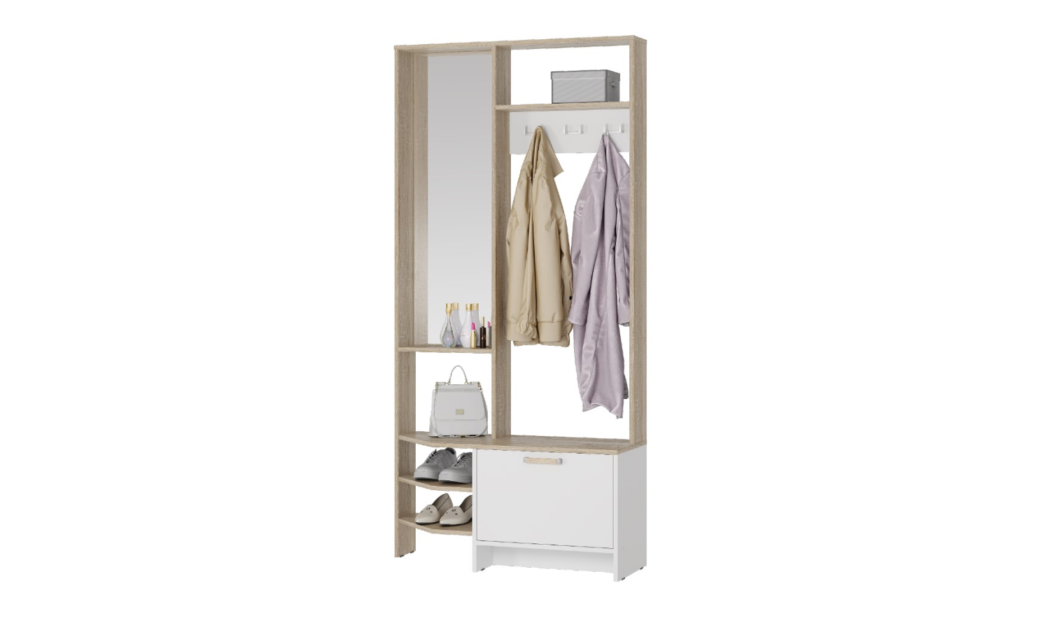 Верхняя полка, оснащенная крючками, прекрасно подходит для хранения головных уборов, таких как шляпы или шапки. Просторная зона с крючками для верхней одежды позволяет навесить много пальто, курток и пиджаков, что особенно актуально в холодную погоду или в период дождей. А нижние открытые и закрытые полки предоставляют возможность удобно хранить сезонную обувь, такую как ботинки или сапоги. Такая организация пространства позволяет сохранить в прихожей порядок и избежать хаоса.