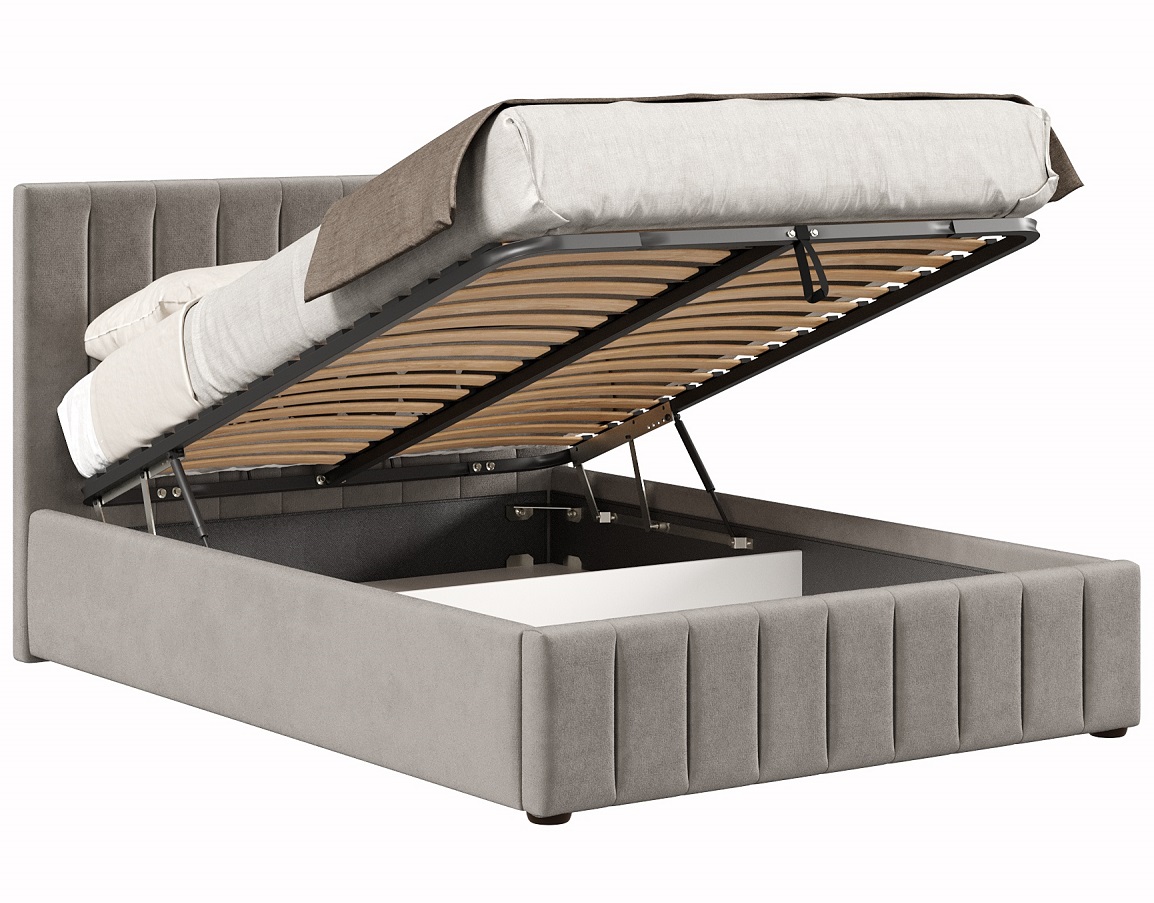 Кровать с подъёмным механизмом Верона в пепельных тонах сочетает в себе эстетику сдержанной роскоши, индивидуальность и практичность. Мягкая обивка создаёт атмосферу уюта, а основание с ламелями обеспечивает комфортный сон. Особенностью этой модели является повторяющийся декор, который украшает спинку и изножье кровати. Вертикальные строчки подчёркивают симметрию и правильные линии кровати.
