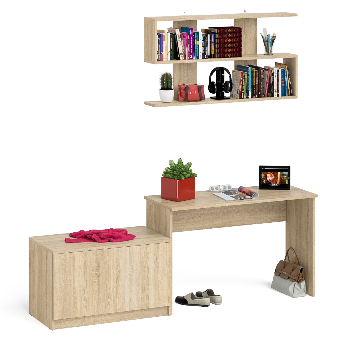 Комплектация включает стол письменный Мори МСП1200.1, тумбу Мори МА900.1 и навесную полку Плк-1200. Отсутствие ручек главное преимущество данной модели. Роль ручек выполняют сами фасады.