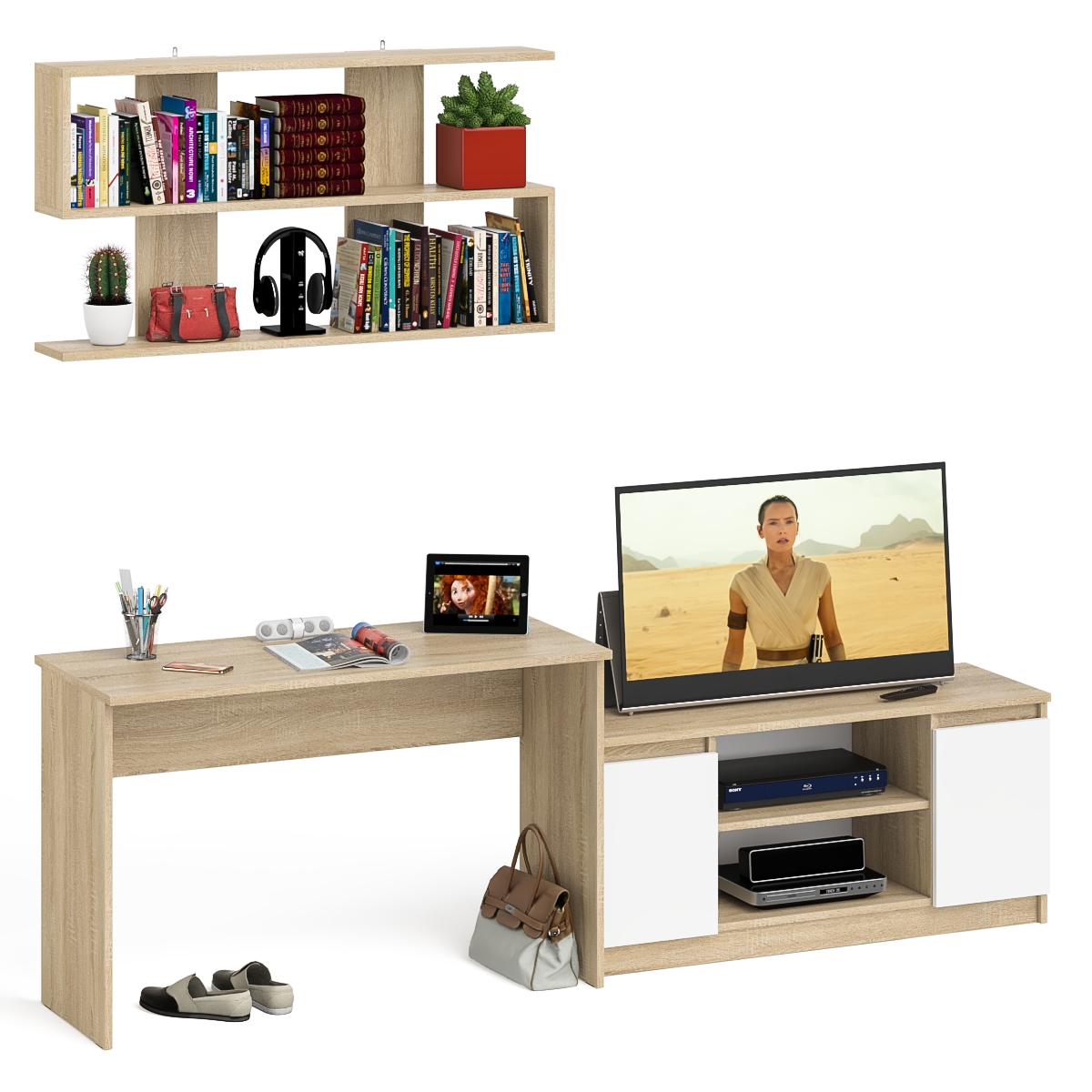 Комплектация включает стол письменный Мори МСП1200.1, тумбу ТВ Мори МТВ1200.1 и навесную полку Плк-1200. Отсутствие ручек главное преимущество данной модели. Роль ручек выполняют сами фасады.