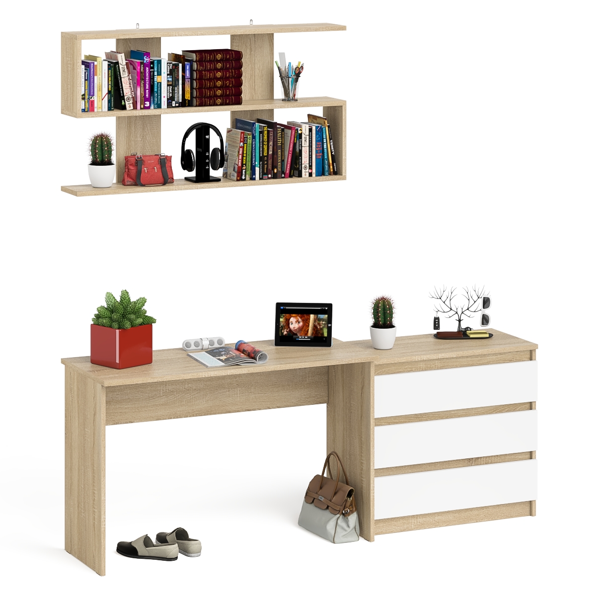 Отзывы о Столплит Комод три ящика Мори 800 с письменным столом 1200 и навесной полкой 1200 Дуб сонома светлый/Белый