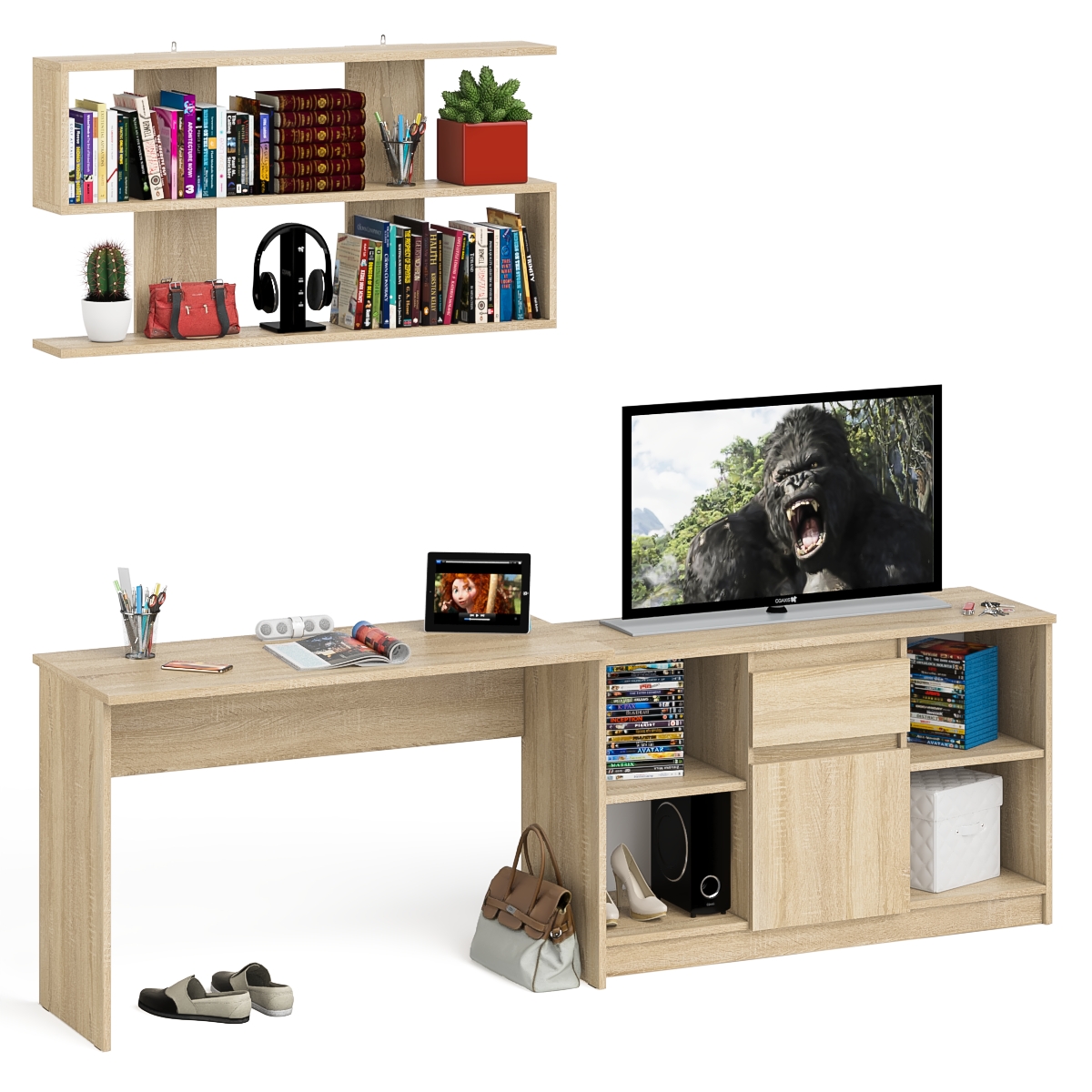 Комплектация включает стол письменный Мори МСП1200.1, тумбу ТВ Мори МТВ1204.1 и навесную полку Плк-1200. Отсутствие ручек главное преимущество данной модели. Роль ручек выполняют сами фасады.
