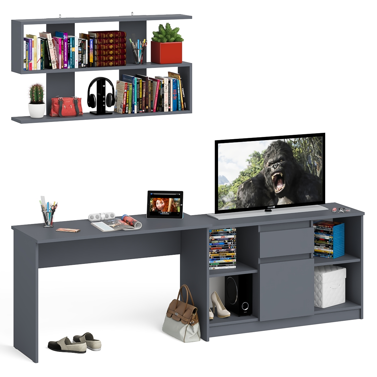 Комплектация включает стол письменный Мори МСП1200.1, тумбу ТВ Мори МТВ1204.1 и навесную полку Плк-1200. Отсутствие ручек главное преимущество данной модели. Роль ручек выполняют сами фасады.