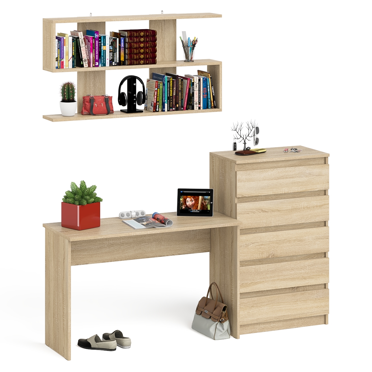 Отзывы о Столплит Комод высокий Мори пять выдвижных ящиков со столом для работы на 1200 и навесной полкой 1200 Дуб Сонома