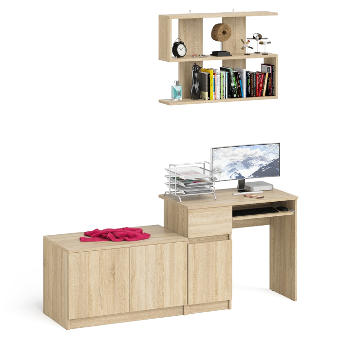 Комплектация включает стол компьютерный Мори МС-1 левый, тумбу Мори МА900.1 и навесную полку Плк-900. Отсутствие ручек главное преимущество данной модели. Роль ручек выполняют сами фасады.