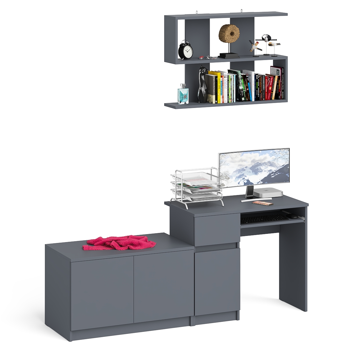 Комплектация включает стол компьютерный Мори МС-1 левый, тумбу Мори МА900.1 и навесную полку Плк-900. Отсутствие ручек главное преимущество данной модели. Роль ручек выполняют сами фасады.