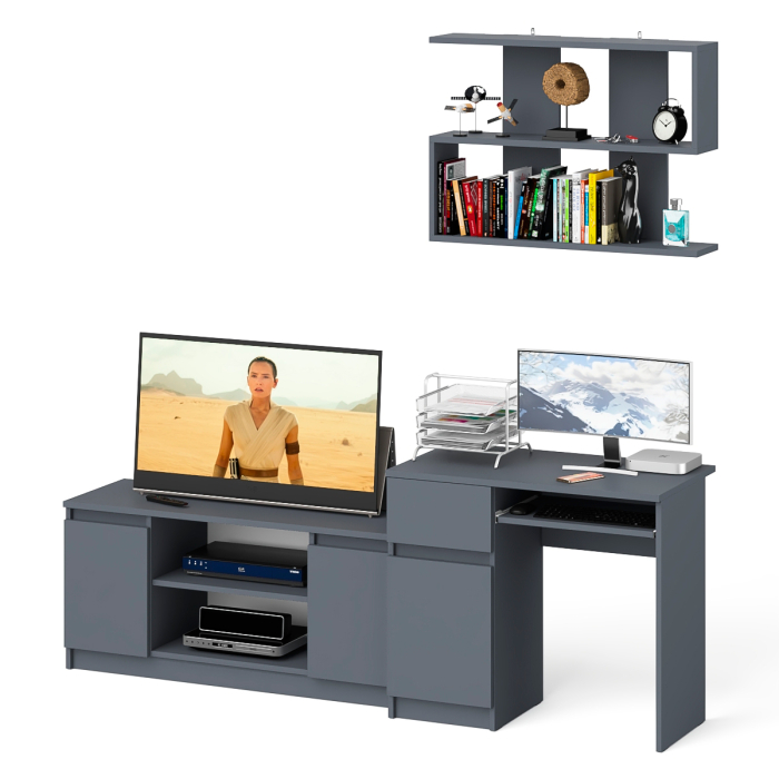 Комплектация включает стол компьютерный Мори МС-1 левый, тумбу ТВ Мори МТВ1200.1 и навесную полку Плк-900. Отсутствие ручек главное преимущество данной модели. Роль ручек выполняют сами фасады.