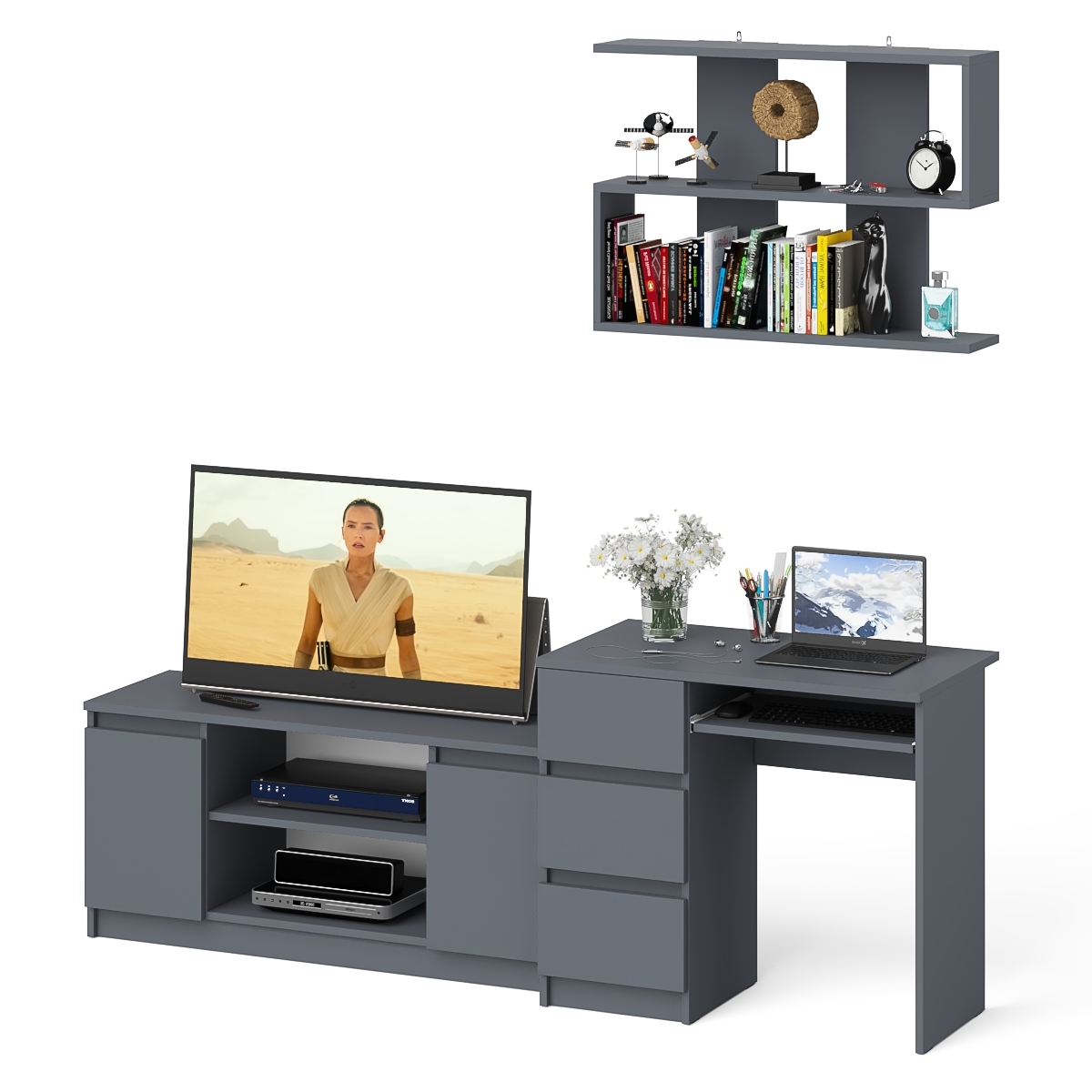 Комплектация включает стол компьютерный три ящика Мори МС-6 левый, тумбу ТВ Мори МТВ1200.1 и навесную полку Плк-900. Отсутствие ручек главное преимущество данной модели. Роль ручек выполняют сами фасады.