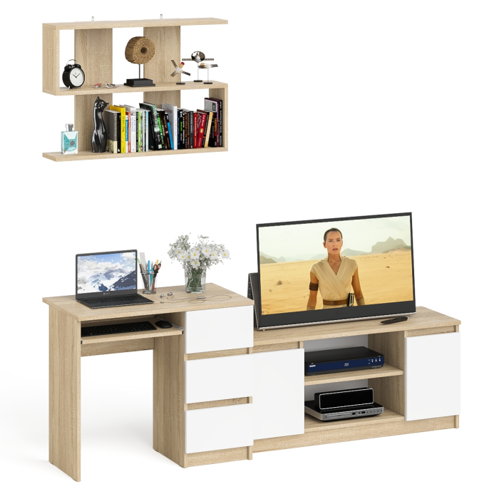 Комплектация включает стол компьютерный три ящика Мори МС-6 правый, тумбу ТВ Мори МТВ1200.1 и навесную полку Плк-900. Отсутствие ручек главное преимущество данной модели. Роль ручек выполняют сами фасады.