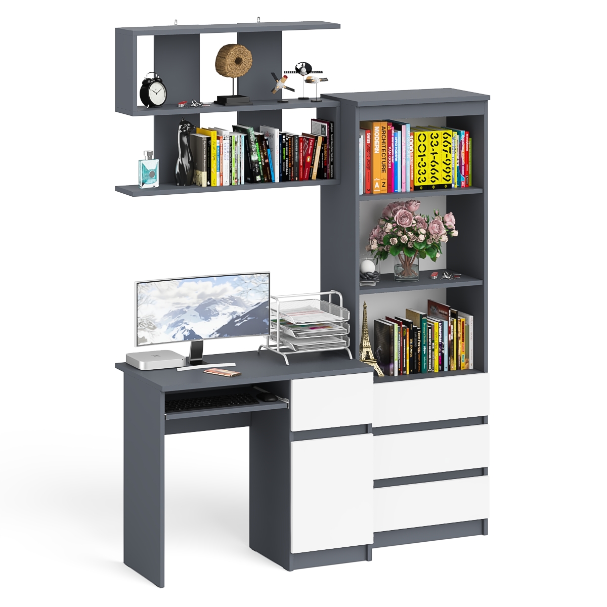 Стол компьютерный Мори МС-1 правый с навесной полкой и стеллаж-комодом 600.3 - минималистичный дизайн и доступная цена позволяет наслаждаться качественной и современной мебелью без значительных финансовых затрат!