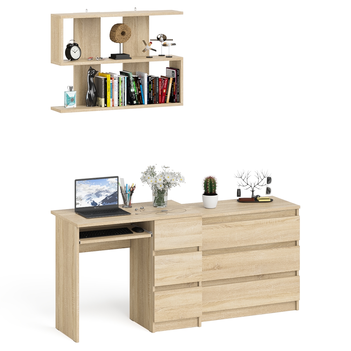 Комплектация включает стол компьютерный три ящика Мори МС-6 правый, комод три ящика Мори МК800.1 и навесную полку Плк-900. Отсутствие ручек главное преимущество данной модели. Роль ручек выполняют сами фасады.