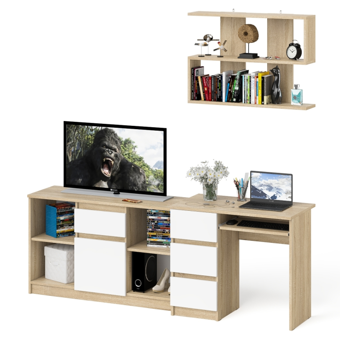 Комплектация включает стол компьютерный три ящика Мори МС-6 левый, тумбу ТВ Мори МТВ1204.1 и навесную полку Плк-900. Отсутствие ручек главное преимущество данной модели. Роль ручек выполняют сами фасады.