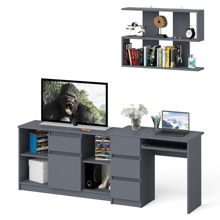 Комплектация включает стол компьютерный три ящика Мори МС-6 левый, тумбу ТВ Мори МТВ1204.1 и навесную полку Плк-900. Отсутствие ручек главное преимущество данной модели. Роль ручек выполняют сами фасады.