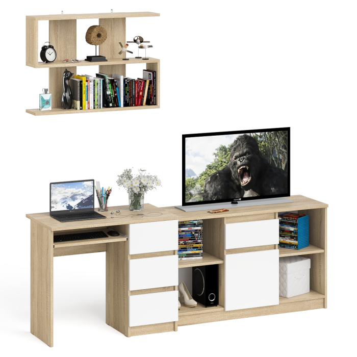 Комплектация включает стол компьютерный три ящика Мори МС-6 правый, тумбу ТВ Мори МТВ1204.1 и навесную полку Плк-900. Отсутствие ручек главное преимущество данной модели. Роль ручек выполняют сами фасады.