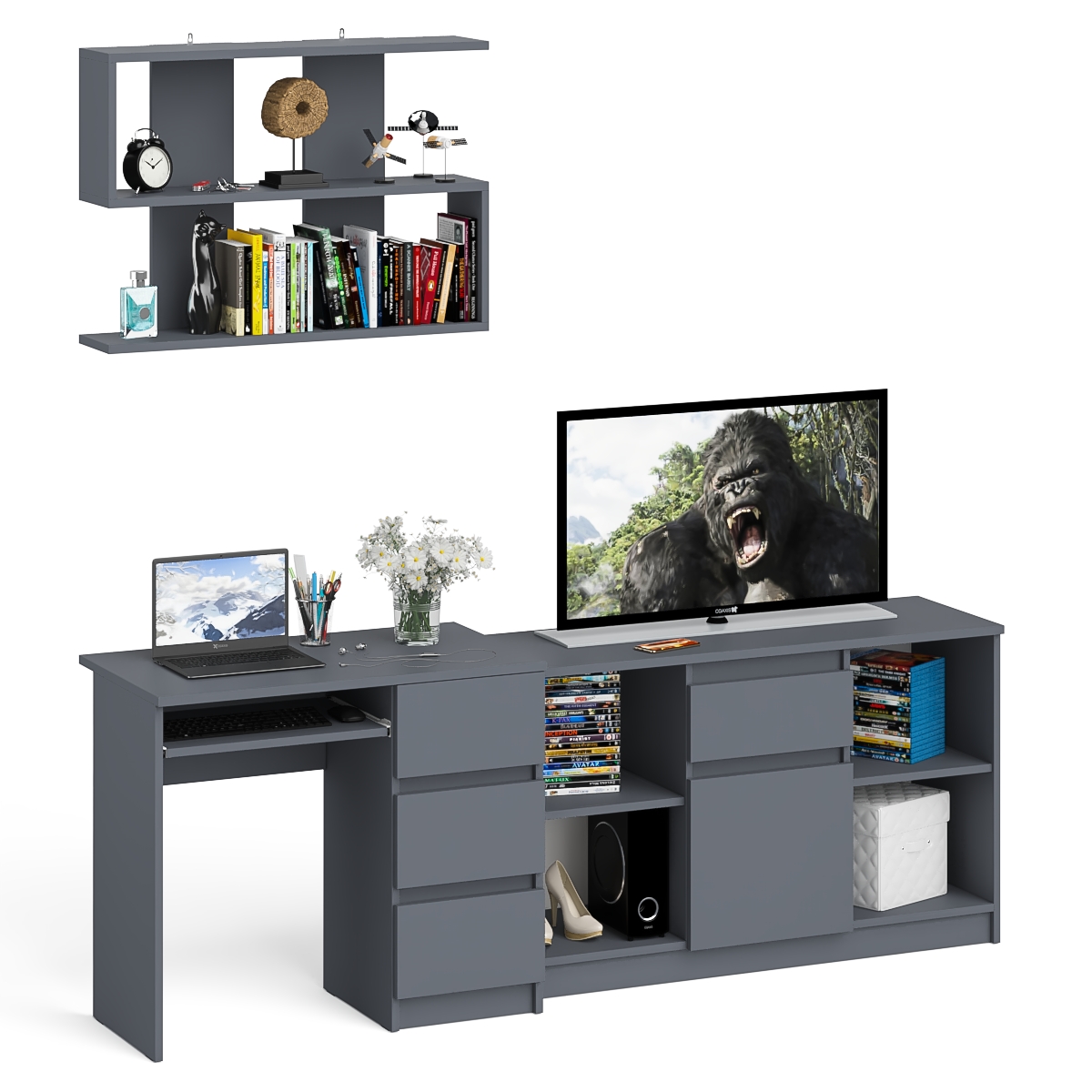 Комплектация включает стол компьютерный три ящика Мори МС-6 правый, тумбу ТВ Мори МТВ1204.1 и навесную полку Плк-900. Отсутствие ручек главное преимущество данной модели. Роль ручек выполняют сами фасады.