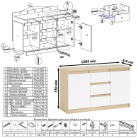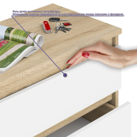 Комод-тумба оборудована по центру тремя выдвижными ящиками и двумя закрытыми отделениями с полками по бокам. Открывание ящиков и дверей производится за счет пространства между планками и фасадами. Выдвижные ящики на роликовых направляющих L=350 мм. неполного выдвижения обеспечивают комфортную эксплуатацию.