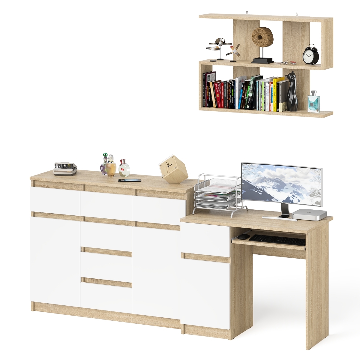 Навесная полка 900 Мори со столом компьютерным МС-1 левый и комодом МК1200.4 - минималистичный дизайн и доступная цена позволяет наслаждаться качественной и современной мебелью без значительных финансовых затрат!
