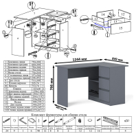 углового стола - 124,4х84,9х76,6 см. Особенности: тумба с ящиками справа.