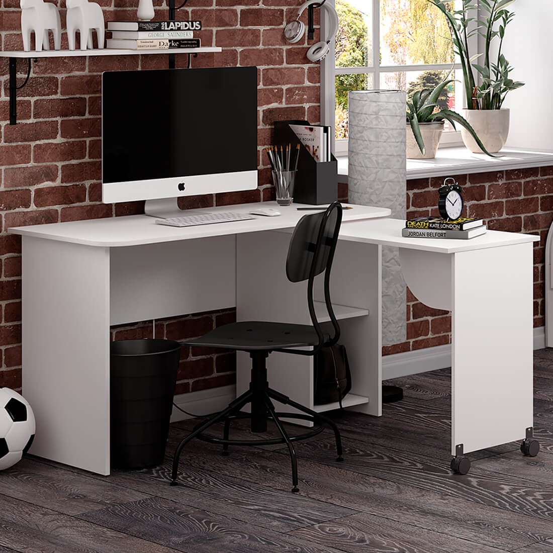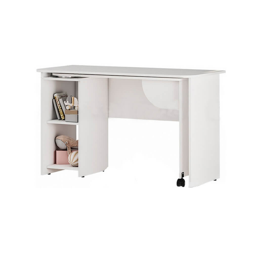 особенностью стола является раздвижная столешница, которая создает дополнительную рабочую поверхность,в двух открытых нишах можно хранить необходимые предметы или канцелярию,белый цвет изделия позволит ему расположиться в любом интерьере.