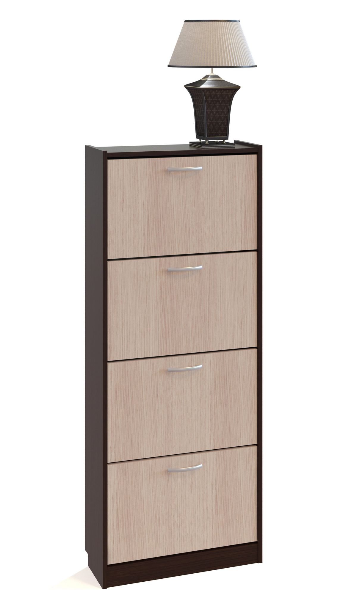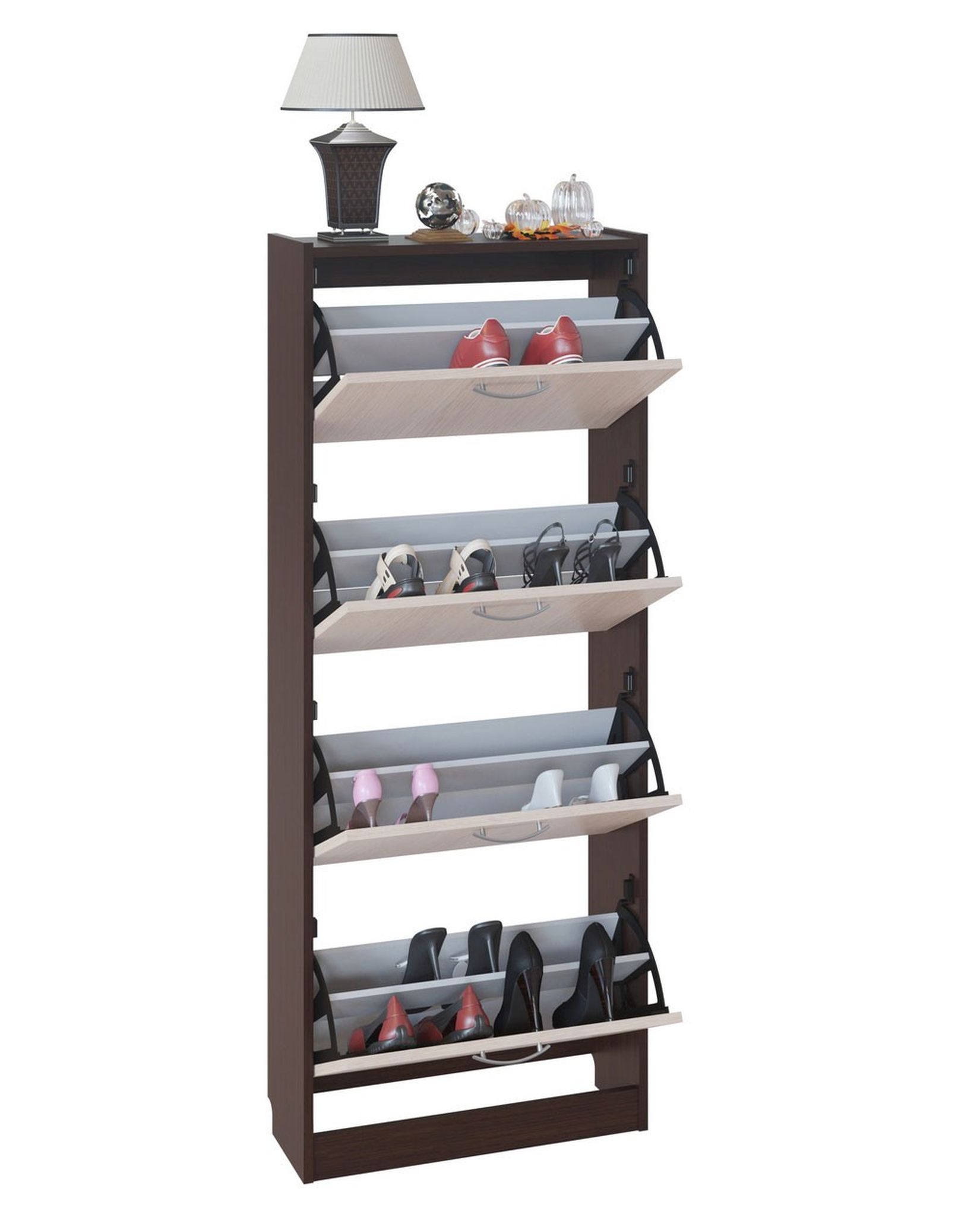Высокая, но узкая тумба для обуви имеет четыре откидные секции для обуви. В каждой секции может разместиться порядка шести пар обуви. Для устойчивости, тумбу нужно крепить к стене. Вся фурнитура входит в комплект.