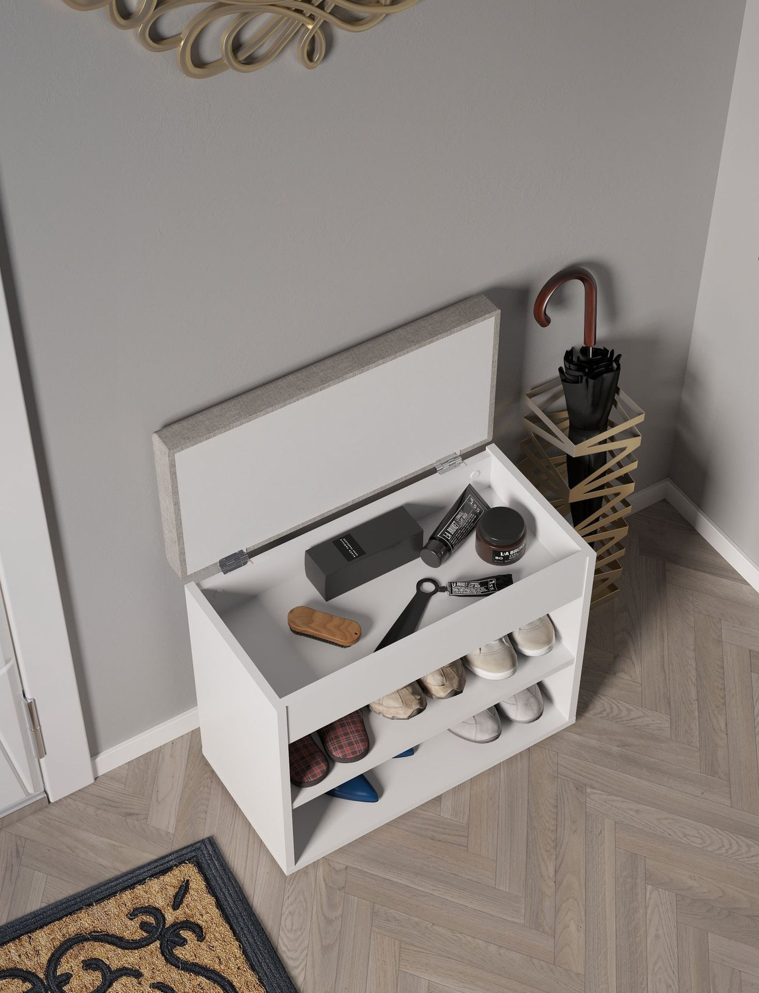 Небольшая тумба для обуви и банкетка отличный вариант для небольшой прихожей. Сидение поднимается и под ним удобная ниша для хранения различных мелочей.