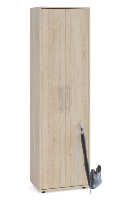 Узкий двухдверный шкаф для очень маленькой прихожей и других комнат. Внутри шкафа расположены две полки и выдвижная вешалка. Изделие изготовлено из ЛДСП толщиной 16 мм.