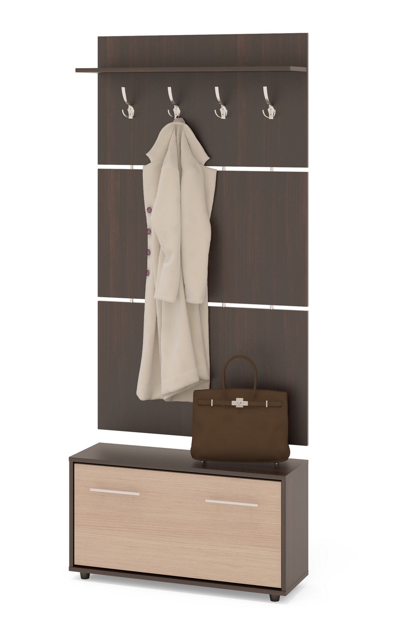 Вешалка изготовлена из высококачественной ЛДСП 16 мм, края отделаны кромкой ПВХ 0.4 мм. Крючки выполнены из металла.