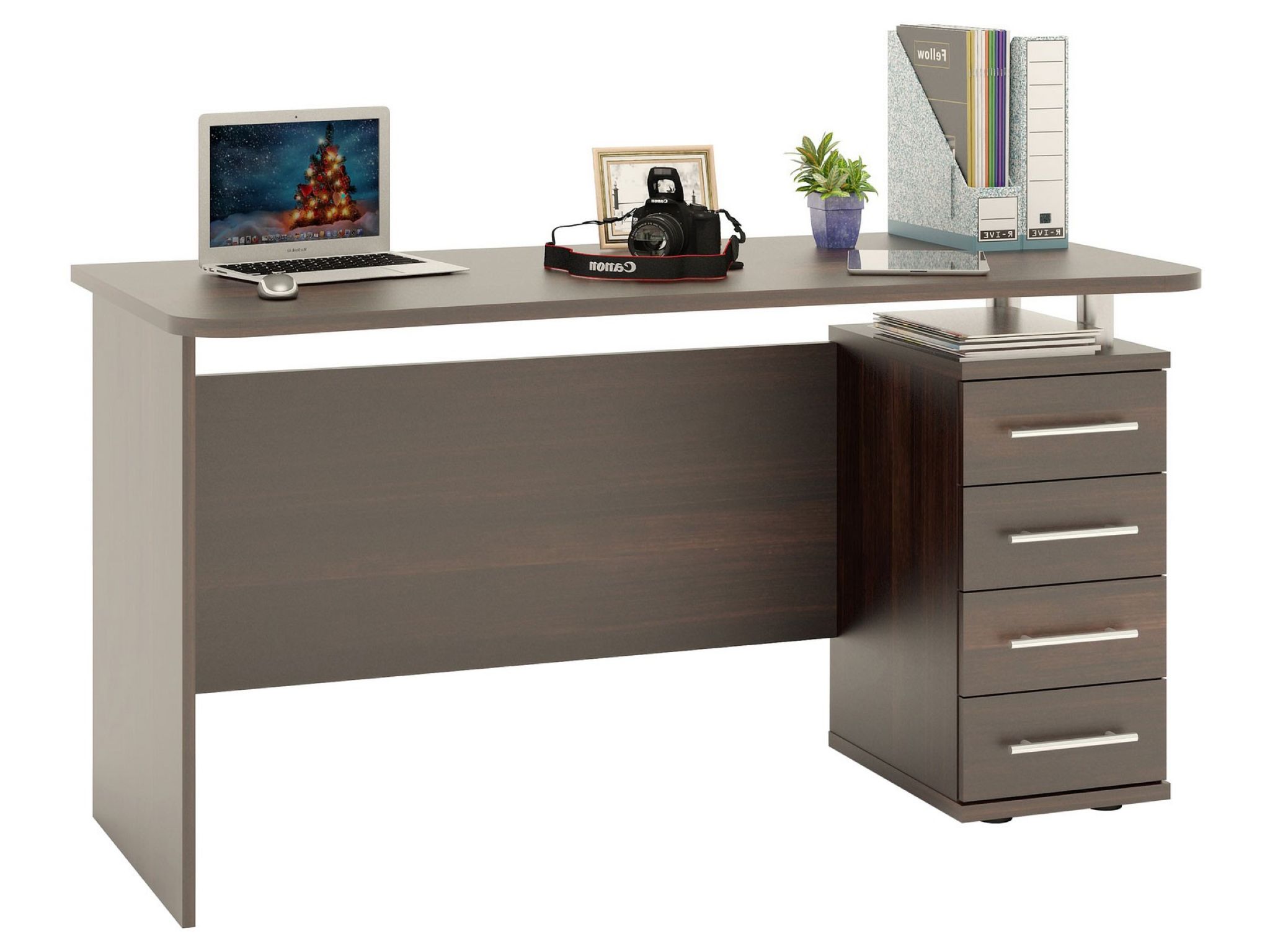 Компьютерный стол с тумбой на четыре выдвижных ящика. Благодаря широкой столешнице, стол позволит организовать полноценное и удобное рабочее место. Передний край столешницы имеет эргономичный изгиб, что сделает работу на столом более комфортной. В середине её глубина составляет 560 мм.