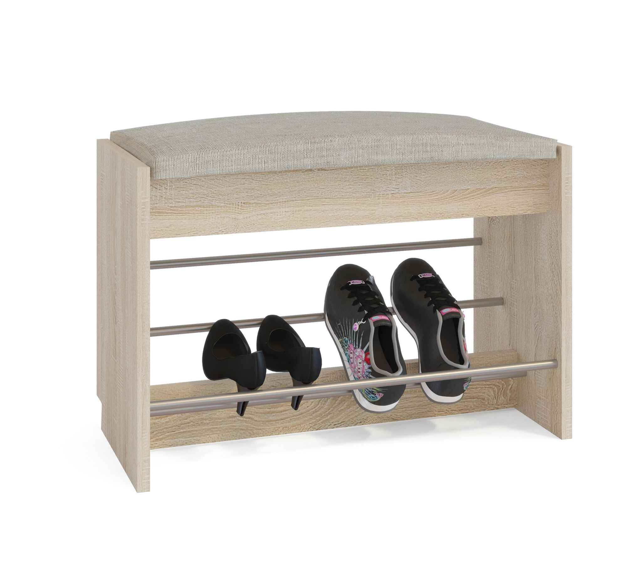 Обувница имеет мягкое и удобное сидение. Это практичное изделие выполняет роль банкетки, пуфа и небольшой тумбы для обуви. Обувница разместит до 4 пар обуви.