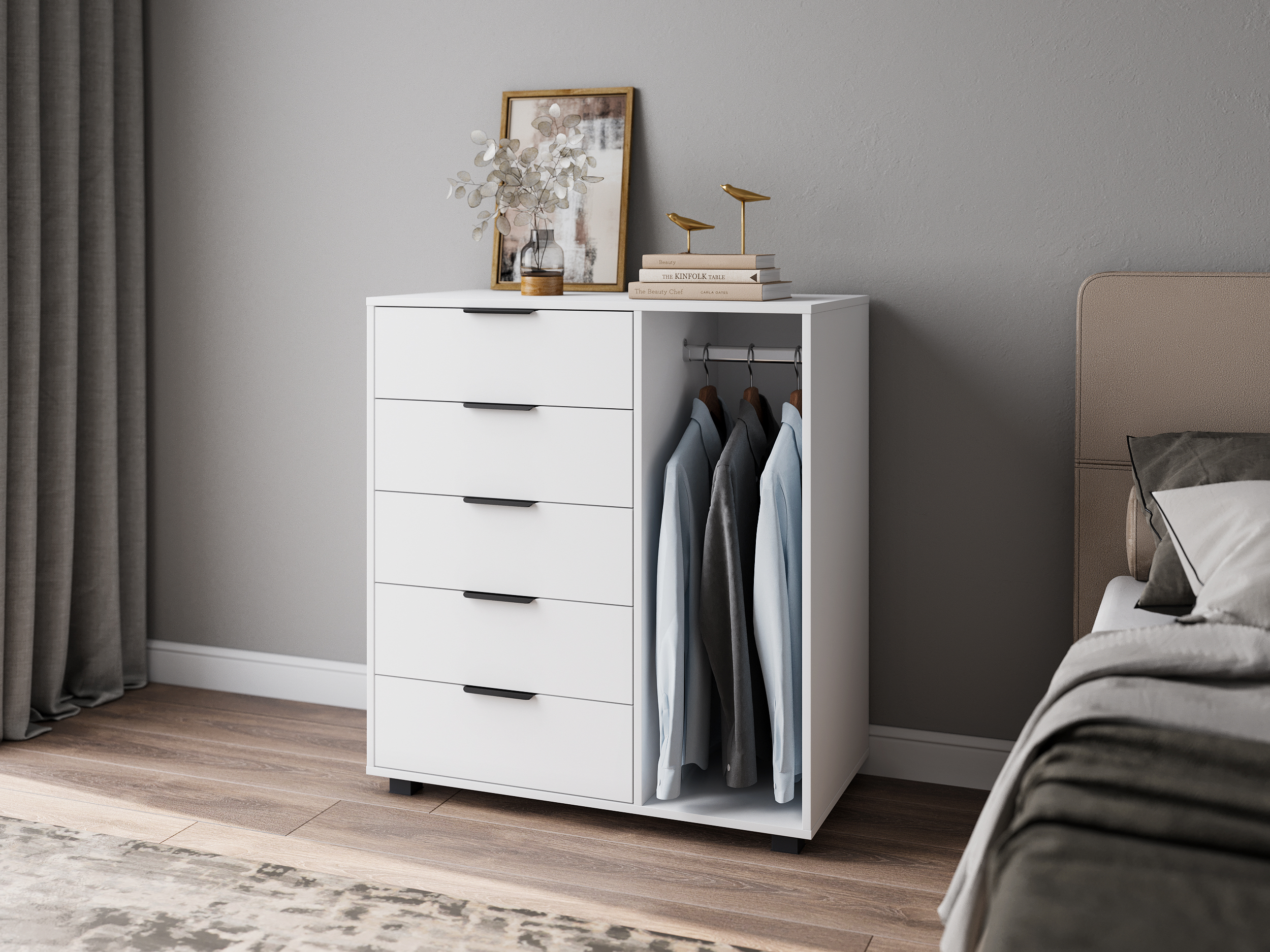 Комод/шкаф комбинированный К-20 отлично дополнит место для хранения в спальне и гостиной. Комод оснащен 5-ю выдвижными ящиками и штангой для пиджаков и рубашек.