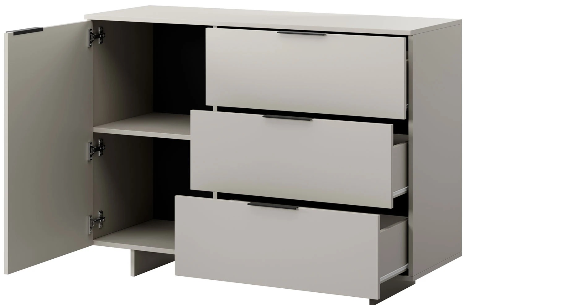 Комплектация: шариковые направляющие 100% выдвижения, петли без доводчиков, ручка торцевая T-10, 128/150 мм черный матовый.