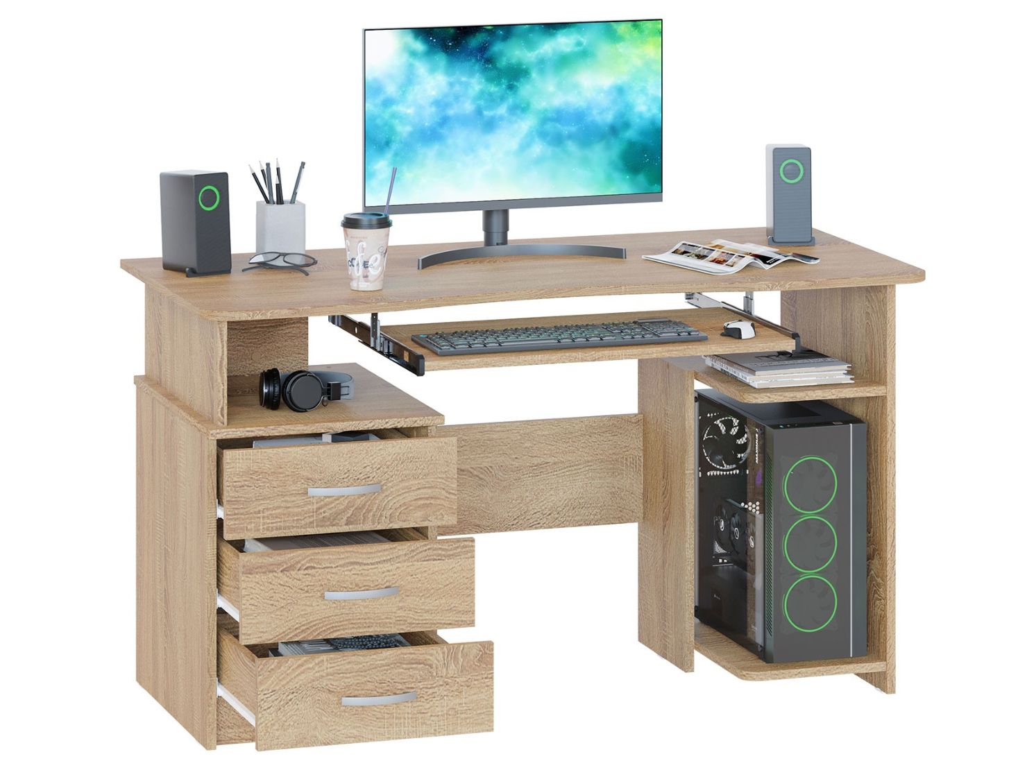 Удобный компьютерный стол. Столешница имеет анатомическую форму, она изготовлена из высококачественного ЛДСП отечественного производства толщиной 16 мм, отделана противоударной кромкой ПВХ. Стол оснащен тумбой с тремя ящиками и полкой под системный блок. Полочка под клавиатуру имеет размеры 650 х 356 мм.