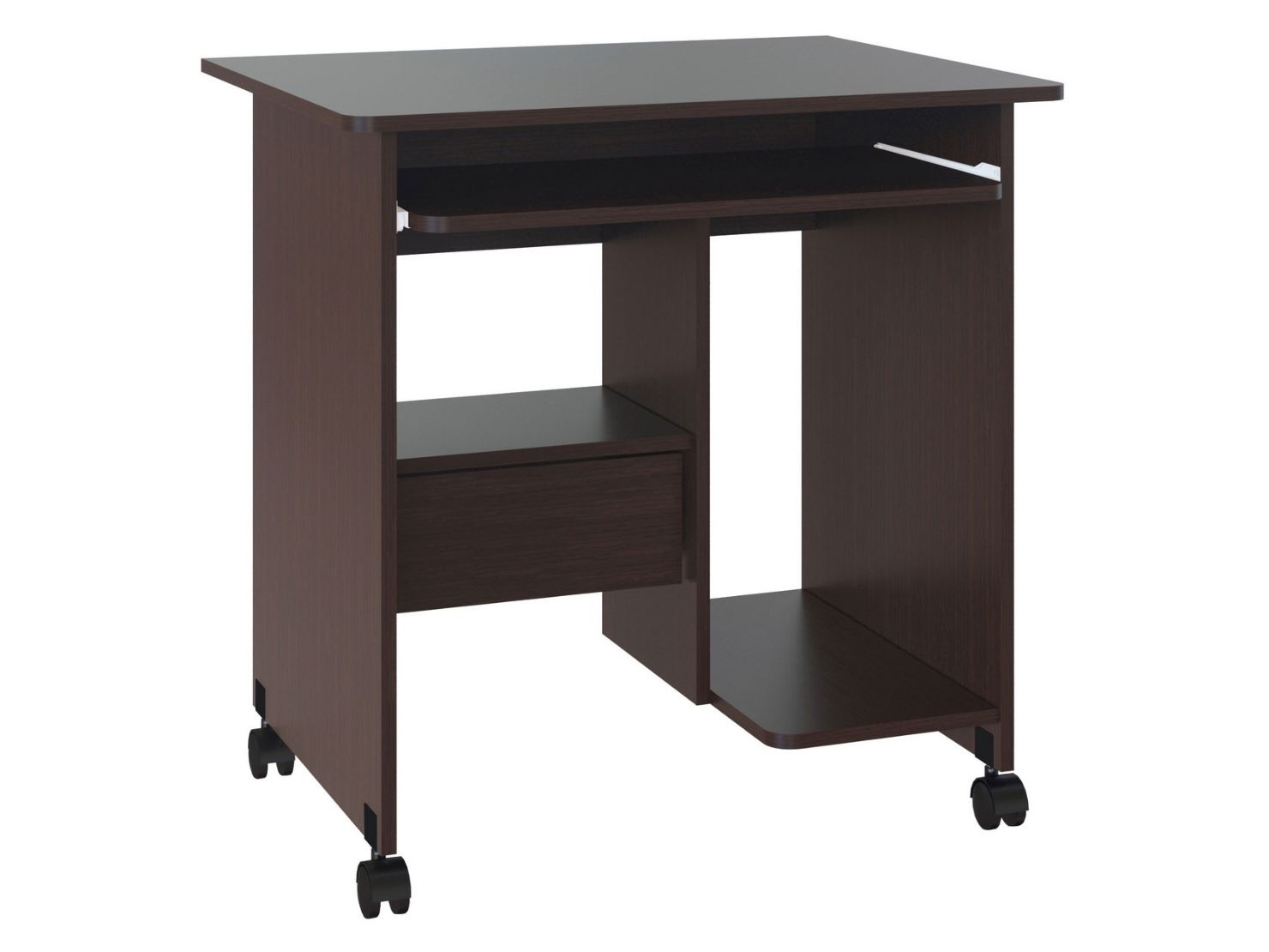 Компактный компьютерный стол на колесиках подойдет для работы как за ноутбуком, так и за полноценным компьютером. На внутренних полочках можно удобно расположить системный блок и даже небольшой принтер.
