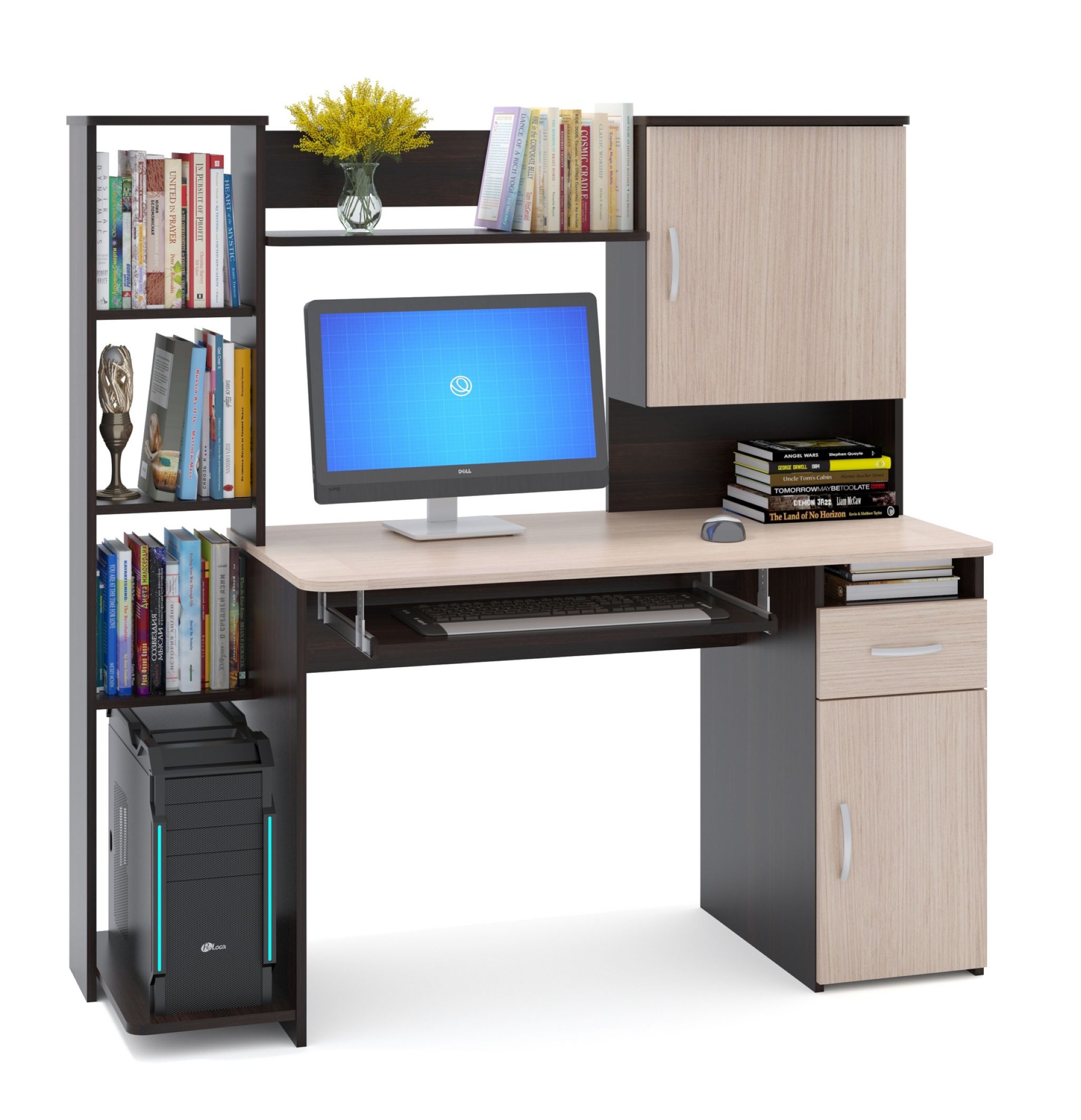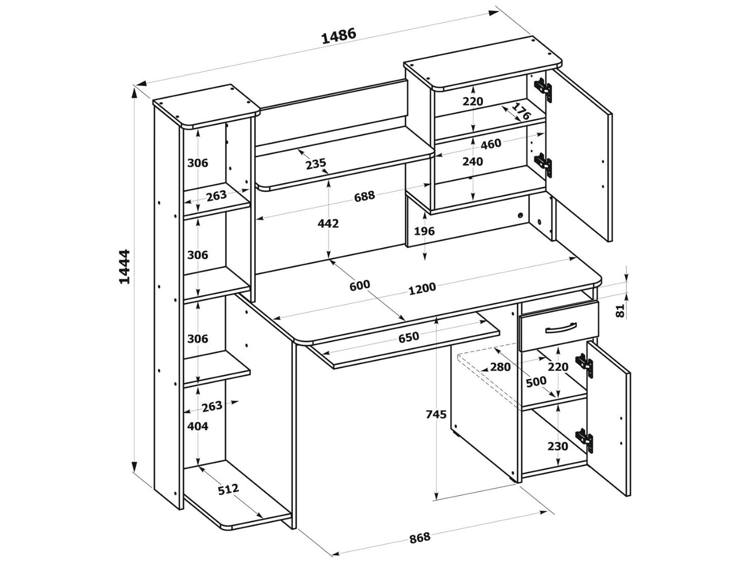 Удобный компьютерный стол с большим количеством полок. Такое решение прекрасно подойдет для организации места для учебы. В боковом стеллаже на нижней полке можно удобно разместить системный блок. За распашными дверками также находятся полки. Стол оборудован выдвижным ящиком и полкой для клавиатуры, которую можно не устанавливать, если вы планируете работать за ноутбуком.