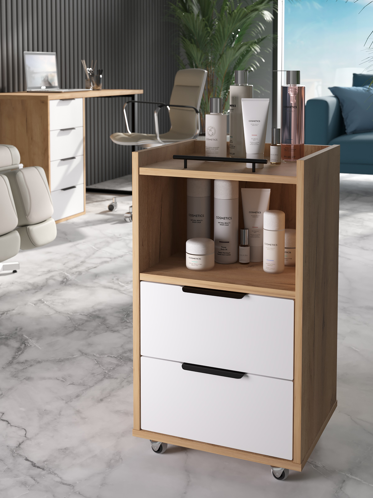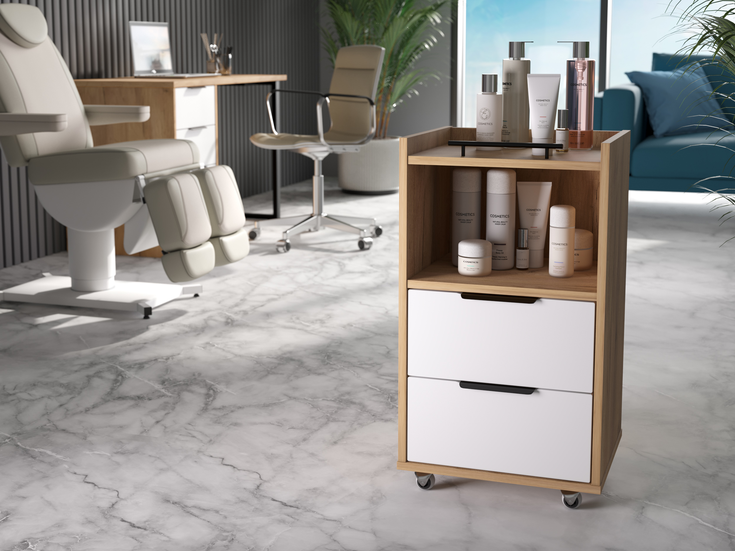 Тумба К-30 подойдет для бизнеса, салонов красоты. Можно использовать как тележку-этажерку, тумбочку косметологическую, парикмахерскую, для массажиста, мастера по маникюру, педикюру, шугарингу, наращивания ресниц. Тумба оснащена полкой и 2-мя выдвижными ящиками для различных мелочей.