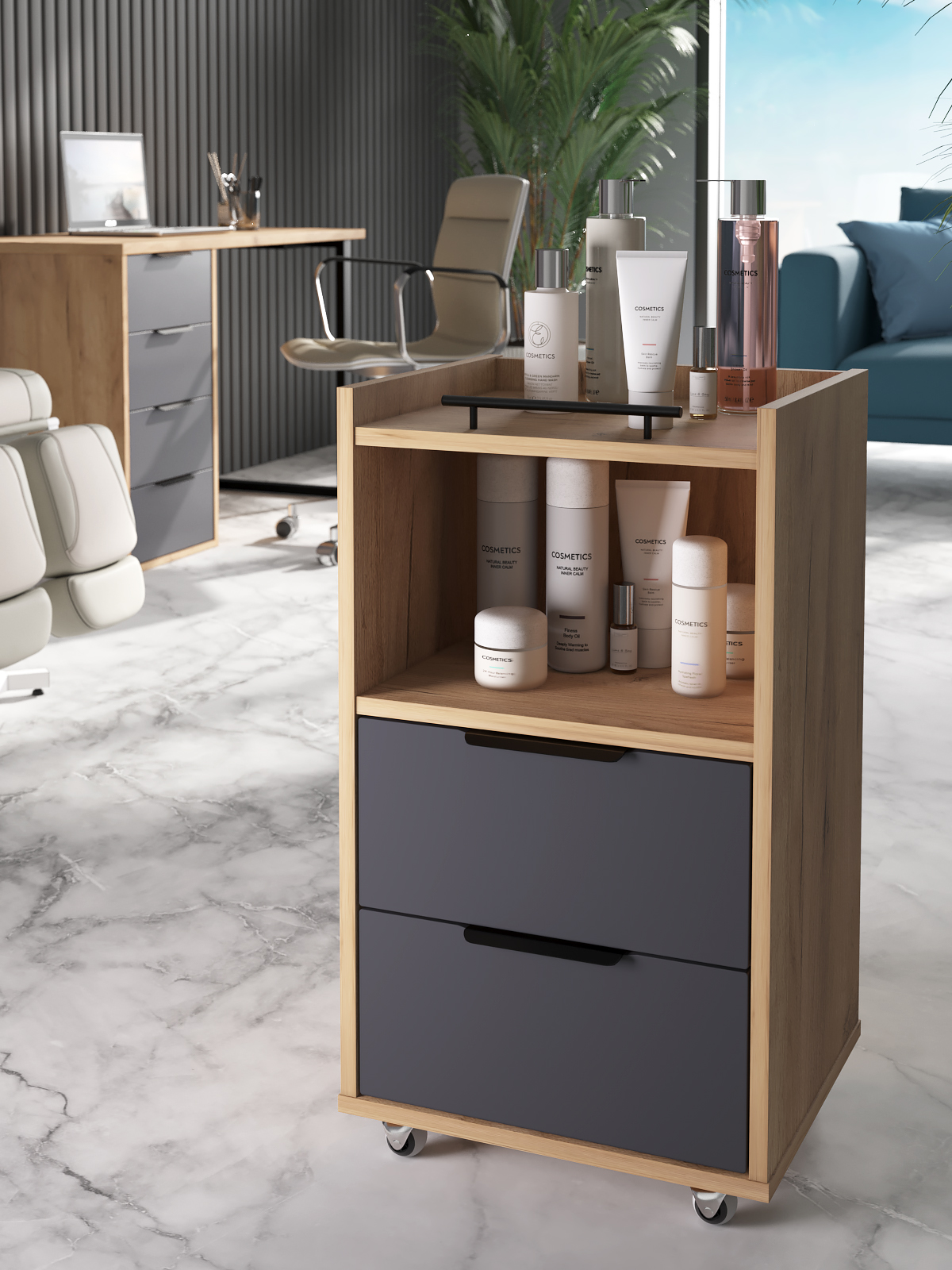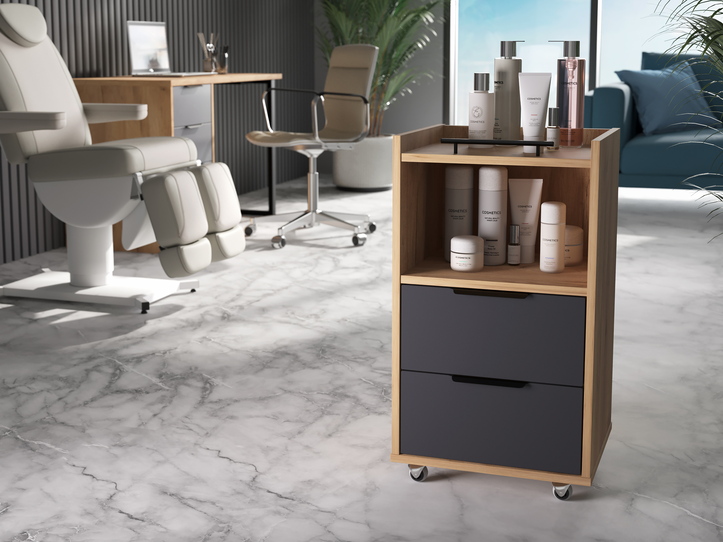 Тумба К-30 подойдет для бизнеса, салонов красоты. Можно использовать как тележку-этажерку, тумбочку косметологическую, парикмахерскую, для массажиста, мастера по маникюру, педикюру, шугарингу, наращивания ресниц. Тумба оснащена полкой и 2-мя выдвижными ящиками для различных мелочей.