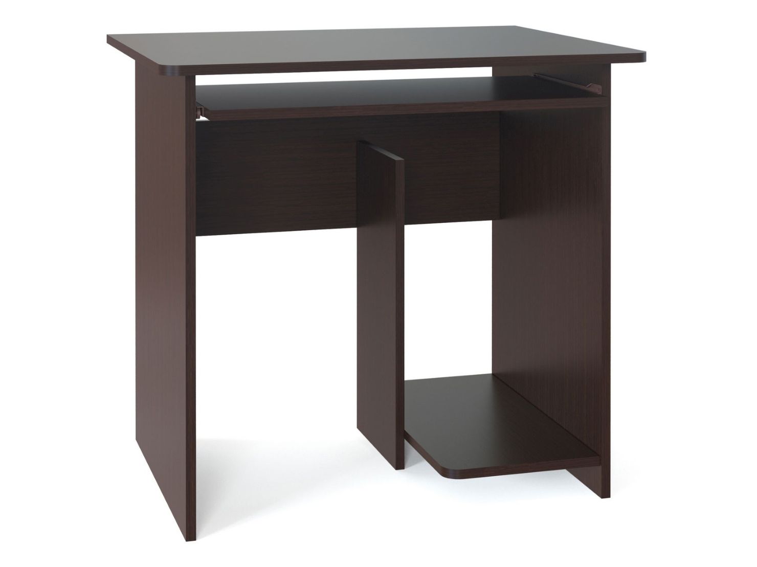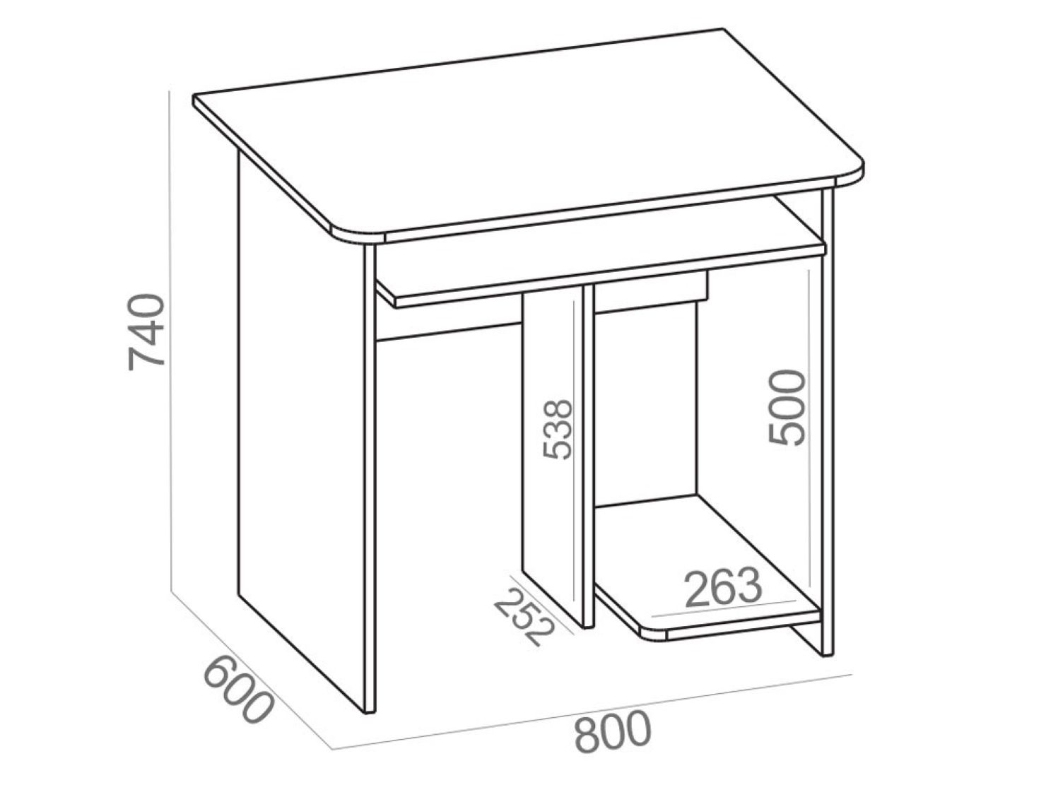 Размеры столешницы — 800 х 600 мм — позволяют установить монитор любой диагонали. Стол оборудован выдвижной полкой для клавиатуры, а в основании с правой стороны расположена ниша под системный блок.
