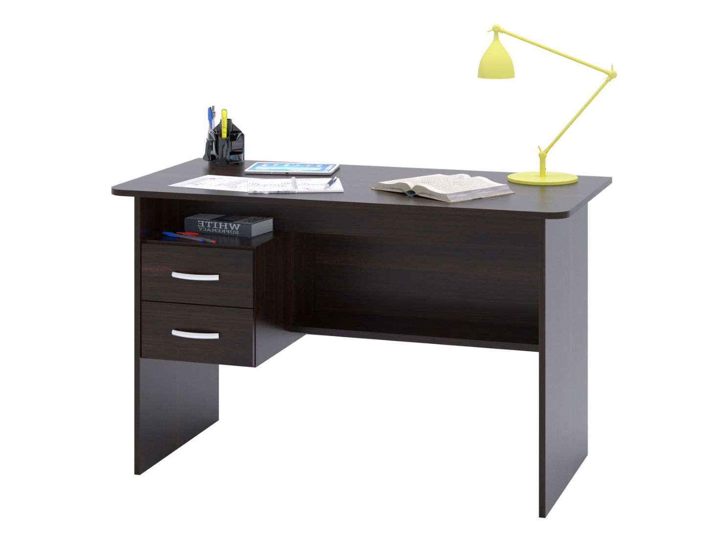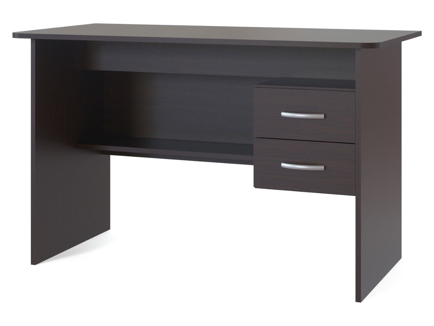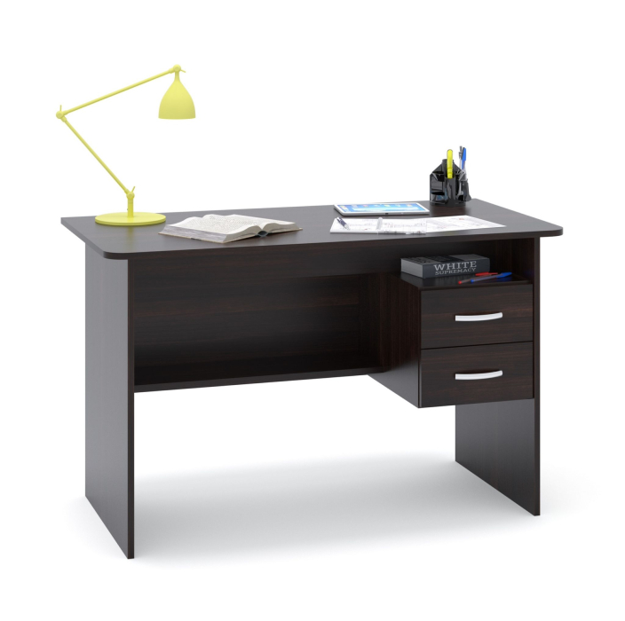 Большой письменный стол со встроенной тумбой. Внизу задней стенки также находится небольшая полочка. Встроенная тумбы состоит из двух ящиков с открытой нишей сверху. За таким столом удобно будет себя чувствовать и школьник и студент. Стол также можно использовать как компьютерный.