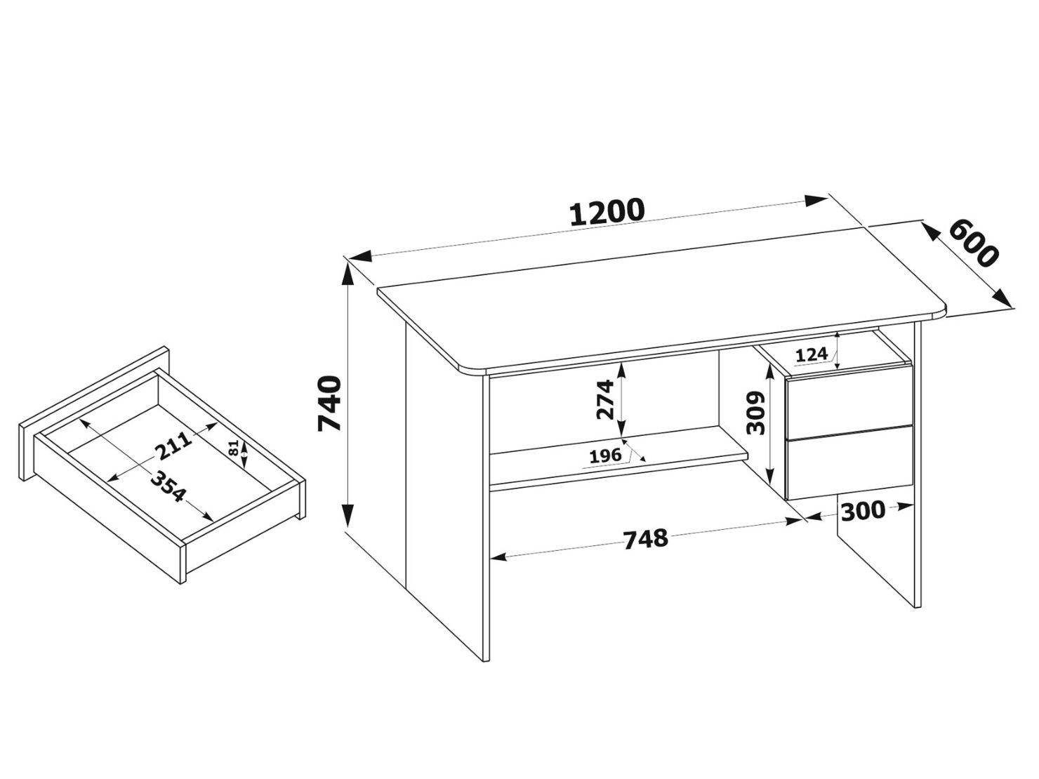 Высота от пола до ящиков составляет 290 мм, высота от пола до полки под столом — 310 мм.