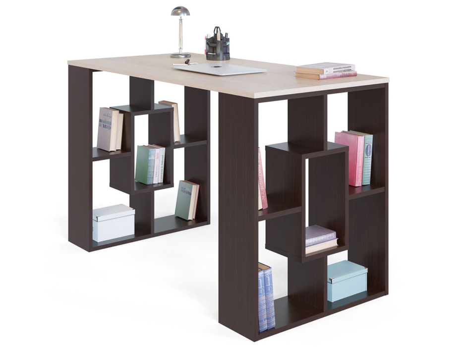 Стильный прямой письменный стол понравится всем любителям минималистичных светлых деталей в интерьере. Создавая эту модель, дизайнеры отошли от привычного оформления письменно стола и сделали его ножки функциональными — в виде стеллажей. Больше не нужно подбирать громоздкие тумбы, на столе достаточно места для ноутбука и нужных в работе материалов, а на его опорах — для книг, канцелярии и любимых предметов для настроения.