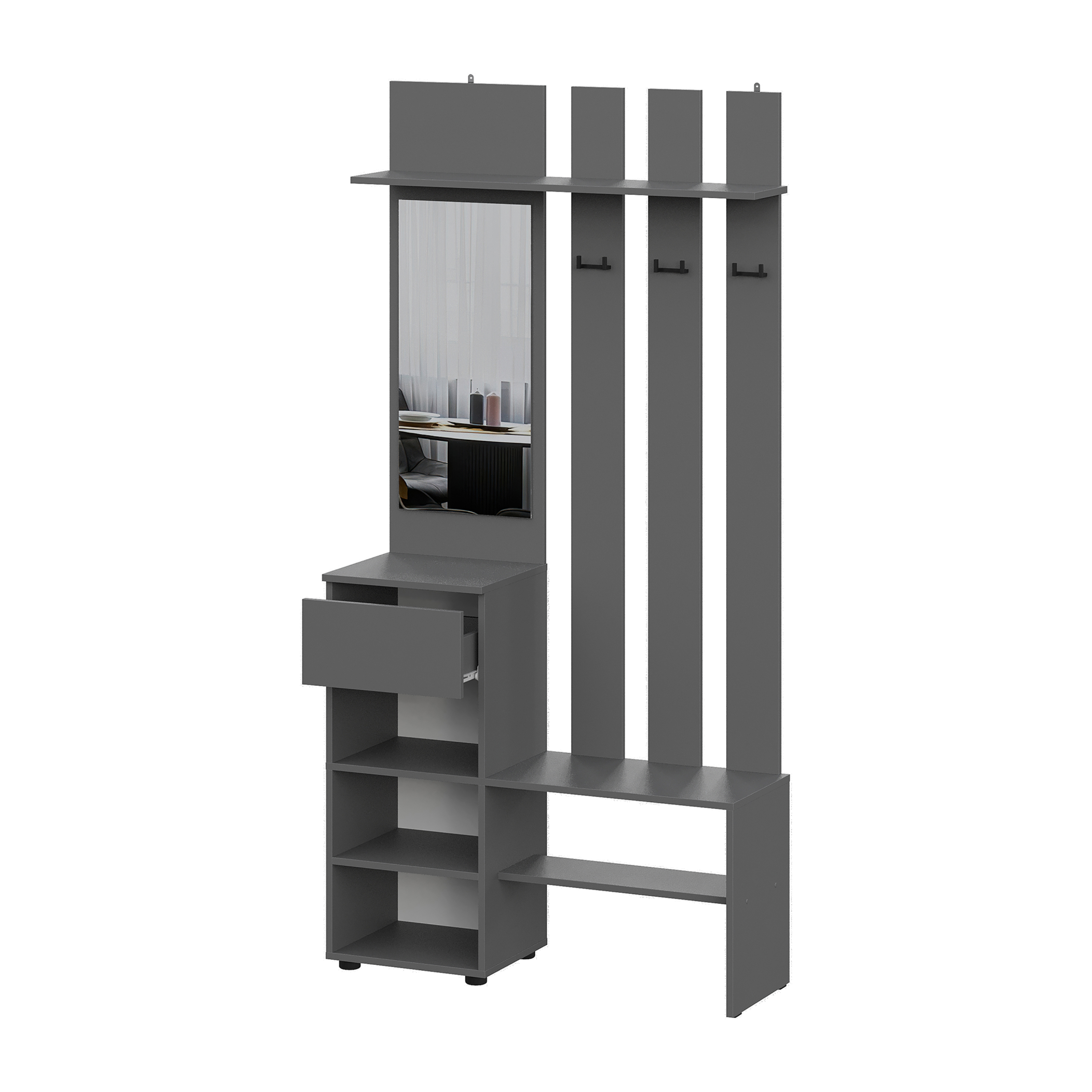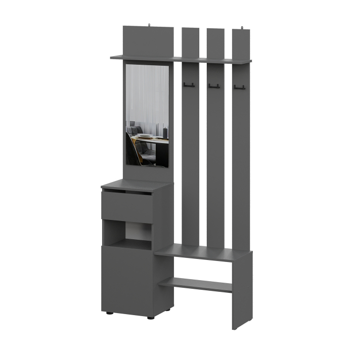 Широкая верхняя полка способствует грамотному распределению хранения. Здесь удобно разместить головные уборы, шарфы или перчатки, что позволяет всегда иметь под рукой необходимые аксессуары. Просторная ниша для обуви устраняет беспорядок на полу, обеспечивая удобный доступ и сохранность обуви. Выдвижной ящик становится дополнительным удобным местом для хранения мелочей, таких как ключи, зонты или другие ежедневные предметы.
