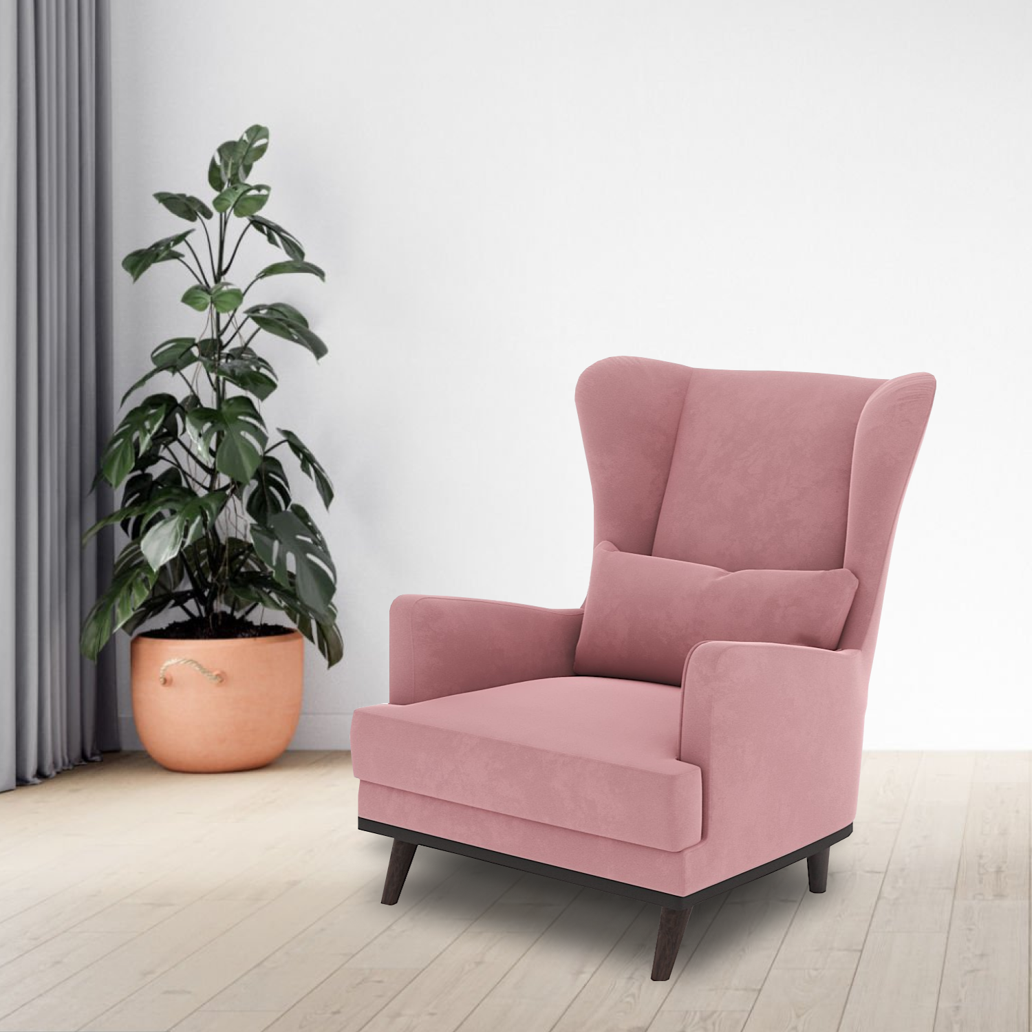 Кресло изготовлено из сухого строганного бруса и фанеры. Наполнитель - Высокоэластичный ППУ. Ножки выполнены из массива дерева цвета Венге. Небольшая подушка идет в комплекте к креслу.