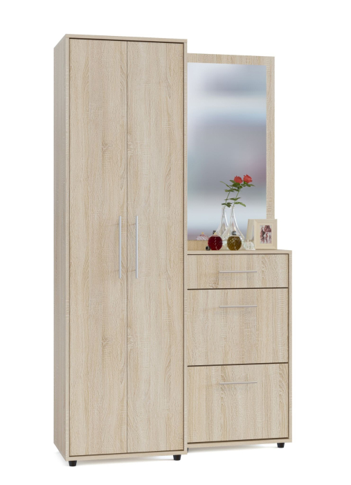 Компактный гарнитур с зеркалом для маленькой прихожей. В шкафу есть выдвижная штанга и две полки. Тумба для обуви имеет два отделения и выдвижной ящик для перчаток, ключей и аксессуаров.