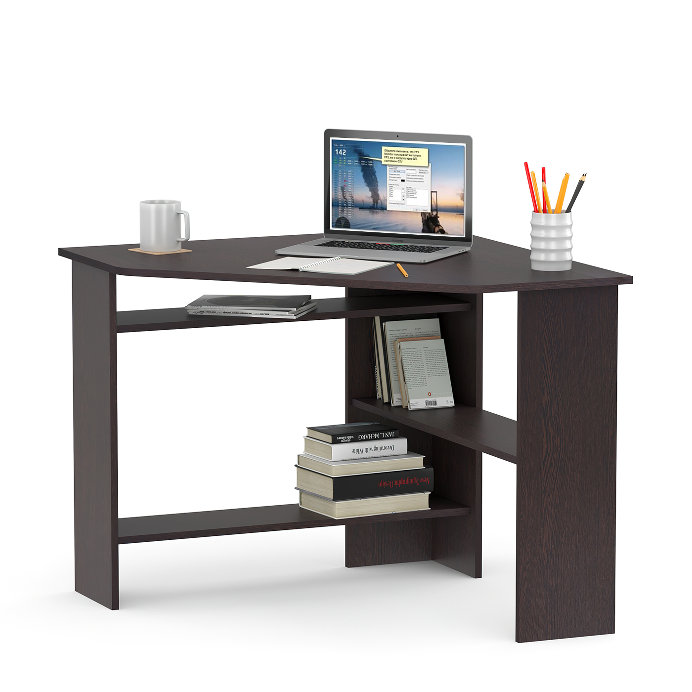 Удобная угловая конструкция позволит максимально практично использовать пространство комнаты. Угловой стол можно использовать как для стационарного ПК, так и для ноутбука. Полки под столешницей 2 слева и одна справа станут удобной системой хранения книг, бумаг и прочей канцелярии. Не универсальная сборка. Можно собрать только так как представлено на изображении - 2 полки слева, одна - справа.