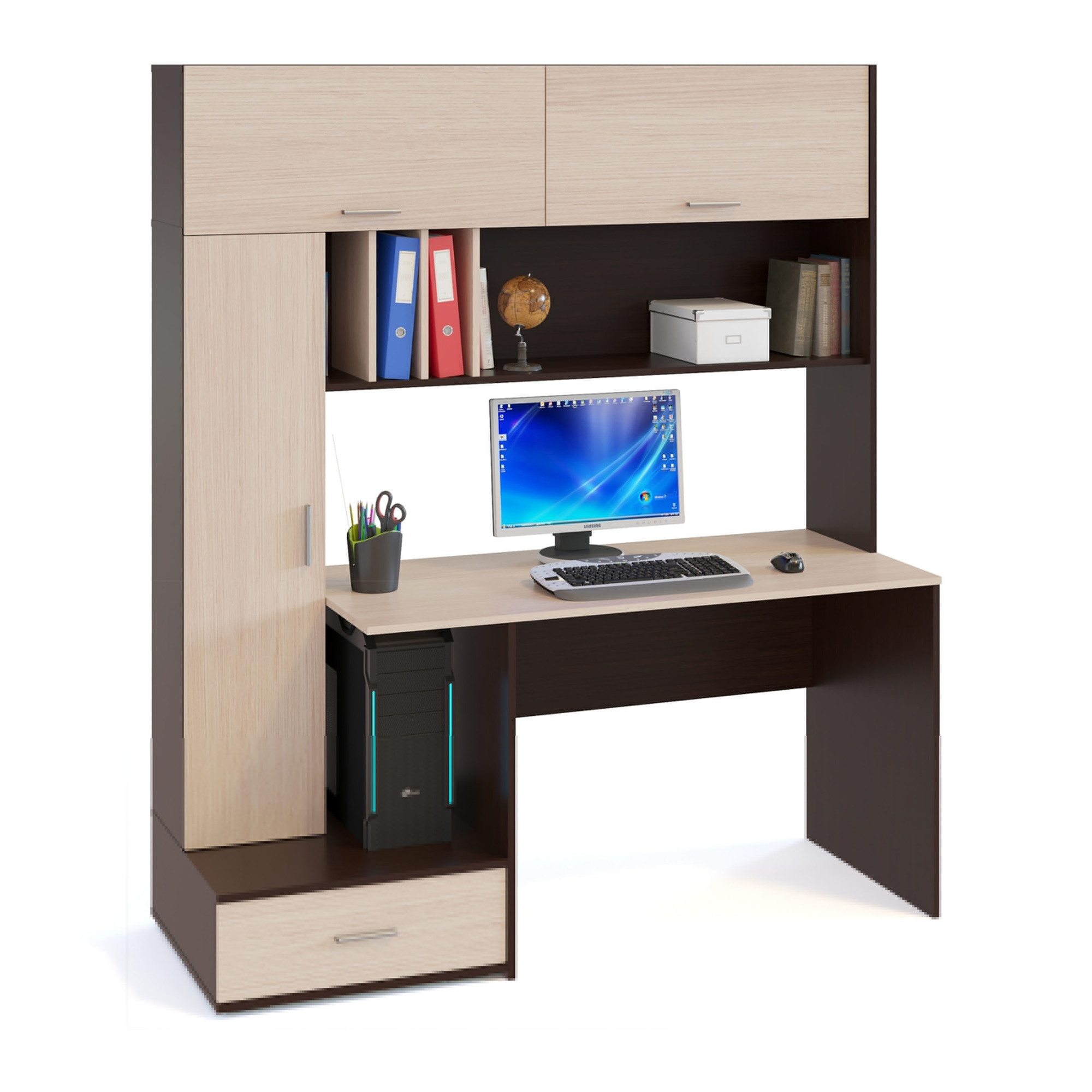 Стол компьютерный Нейтан - эргономичный комплекс с широкой столешницей, удобной надстройкой и вместительным стеллажом. Надстройка оборудована открытой полочкой и двумя закрытыми отделениями с подъёмными дверцами на газовых лифтах. Стеллаж, с закрытым распашной дверью отделением с тремя полками, расположен слева. Универсальная сборка не предусмотрена. На столешнице достаточно место для монитора любого размера. Ниша под монитор (120х42 см.) бережно сохранит его от внешних воздействий. Под столешницей расположена ниша под системный блок, размером 30х48 см. и выдвижной ящик на шариковых направляющих. Практичный стеллаж, ниши и полочки надстройки разместят все Ваши рабочие и учебные принадлежности, книги и деловые бумаги. Лаконичный дизайн стола компьютерного, дополняют актуальные сочетания цветов фасада и корпуса, стильные ручки. Модный и удобный стол компьютерный Нейтан легко интегрируется в интерьер кабинета или офиса любого стиля.