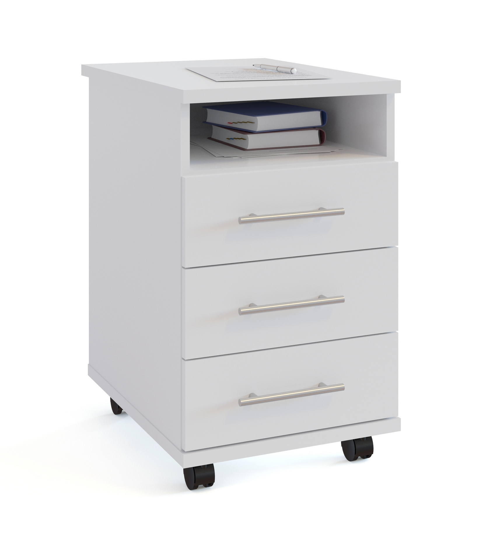 Это универсальная приставная тумба с тремя выдвижными ящиками и открытой нишей сверху для канцелярский принадлежностей и прочих мелочей.