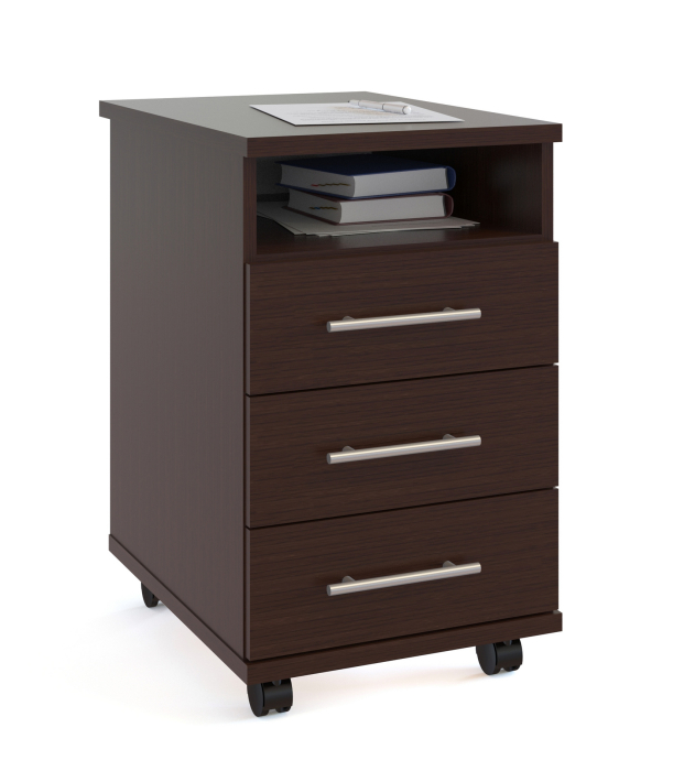 Это универсальная приставная тумба с тремя выдвижными ящиками и открытой нишей сверху для канцелярский принадлежностей и прочих мелочей.