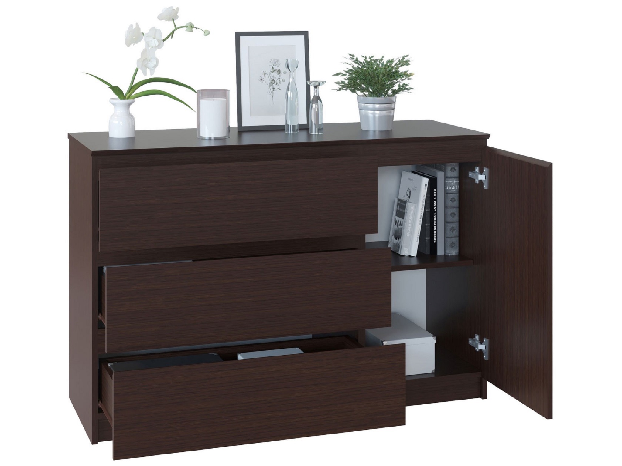 Три вместительных выдвижных ящика дополнены распашным отделением с полочкой.