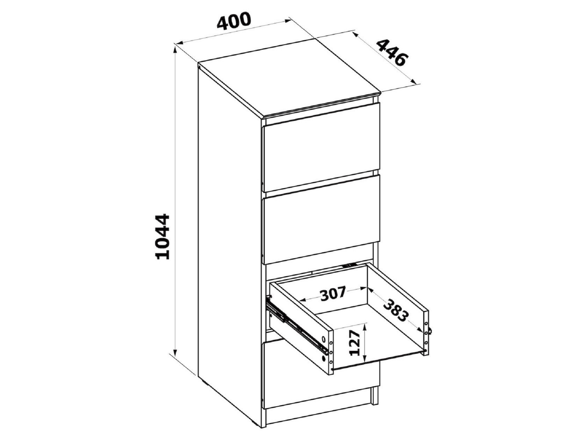 Узкий и высокий Комод Т-4Р легко разместится в любой даже небольшой комнате или прихожей. Особенностью комода Т-2Р является открывание ящиков без ручек, благодаря спилу под 45° в верхней части фасадов.